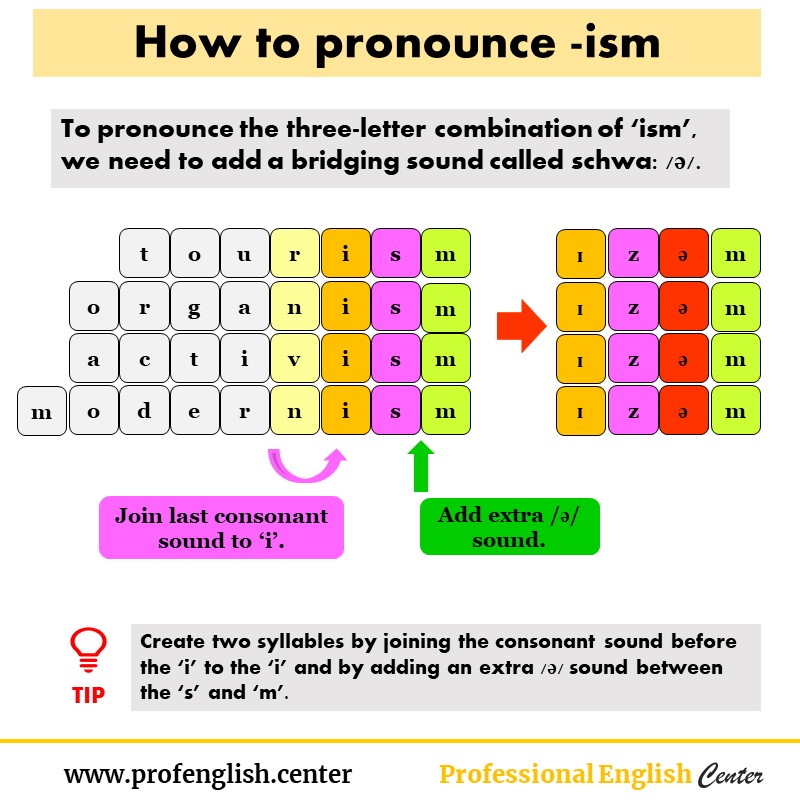 Now that you know how to say the ə sound, let’s look at -ism again. Although we write only three letters (ism), we pronounce four sounds by putting a schwa between the consonants. Therefore, -ism becomes -i-s-ə-m.
